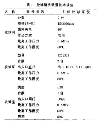 山西電廠捷制500MW機組主機凝汽器配套的膠球清洗裝置包括活動式收球網、膠球泵、裝球室、膠球再循環管路、膠球再噴射裝置、膠球再循環監督裝置和差動壓力測量系統等。其作用是在機組運行過程中,供助水流將海綿膠球擠過凝汽器銅管,并不斷循環,擦洗掉銅管內的垢物,提高熱交換效率,降低凝汽器端差,提高汽輪機組真空.技術規范見表1。