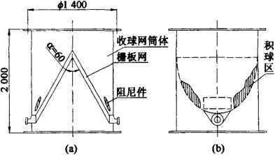 例如某制造廠為1臺N6815型凝結(jié)器配套的巾1400三代網(wǎng),原設(shè)計中兩柵板網(wǎng)之間夾角過大(大于60。),且阻尼件在流場中的位置布置不適當(dāng),形狀也不合理,因此造成實際運行中柵網(wǎng)面上大面積停球,如圖lb所示。無法產(chǎn)生球流的正常循環(huán),清洗效果極差,膠球的回收率只有10%~20%。又如另一制造廠NT100-ID型凝結(jié)器配套的巾1400三代網(wǎng)柵板和阻尼環(huán)設(shè)計雖基本準(zhǔn)確,但是收球效率也只有50%-60%,網(wǎng)內(nèi)積球嚴(yán)重。